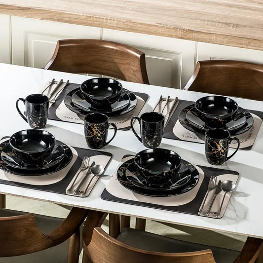 MarbellaGold | 16-Delig Zwart Porseleinen Servies met Gouden Marmerpatroon – Voor 4 Personen